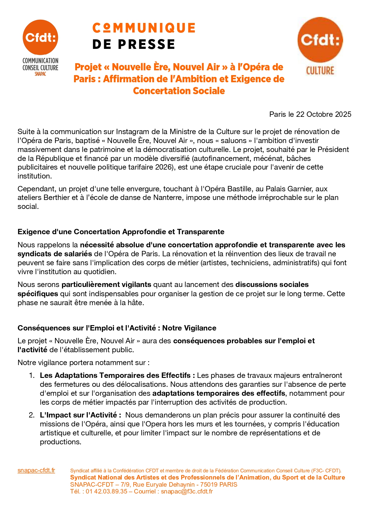 Nous rappelons la nécessité absolue d’une concertation approfondie et transparente avec les syndicats de salariés de l’Opéra de Paris. La rénovation et la réinvention des lieux de travail ne peuvent se faire sans l’implication des corps de métier (artistes, techniciens, administratifs) qui font vivre l’institution au quotidien.