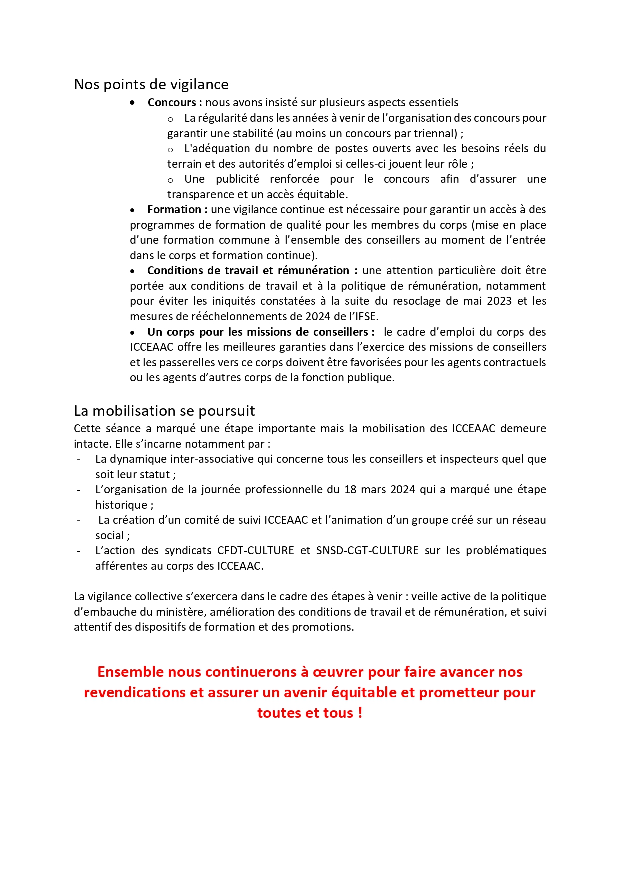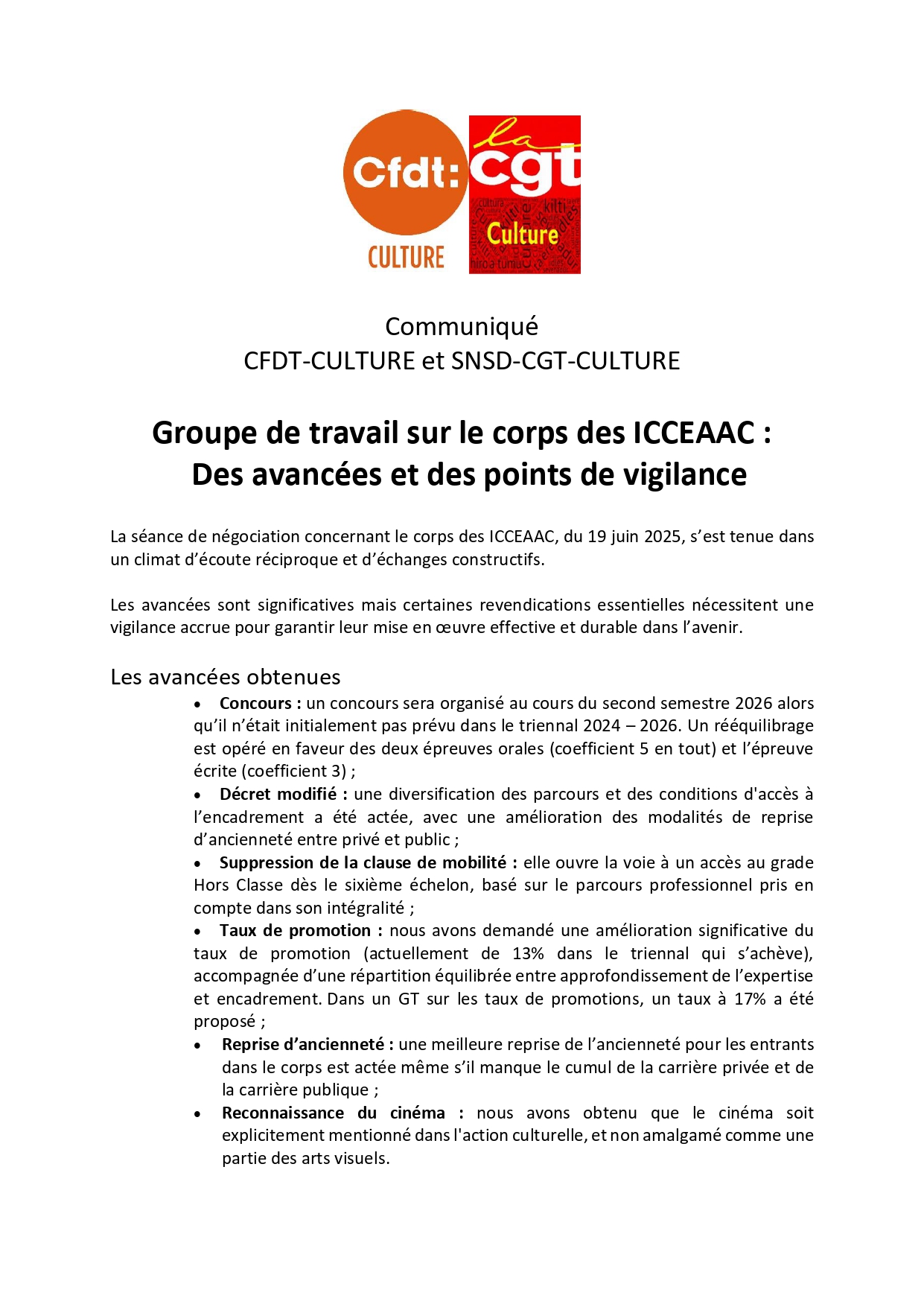 La séance de négociation concernant le corps des ICCEAAC, du 19 juin 2025, s’est tenue dans un climat d’écoute réciproque et d’échanges constructifs. Les avancées sont significatives mais certaines revendications essentielles nécessitent une vigilance accrue pour garantir leur mise en œuvre effective et durable dans l’avenir.